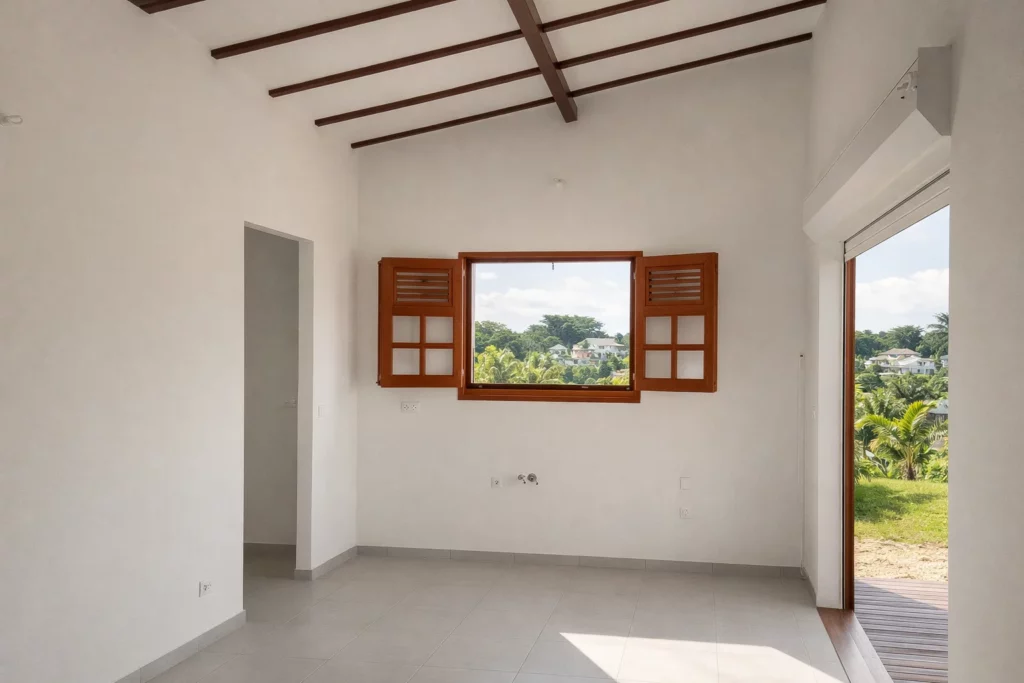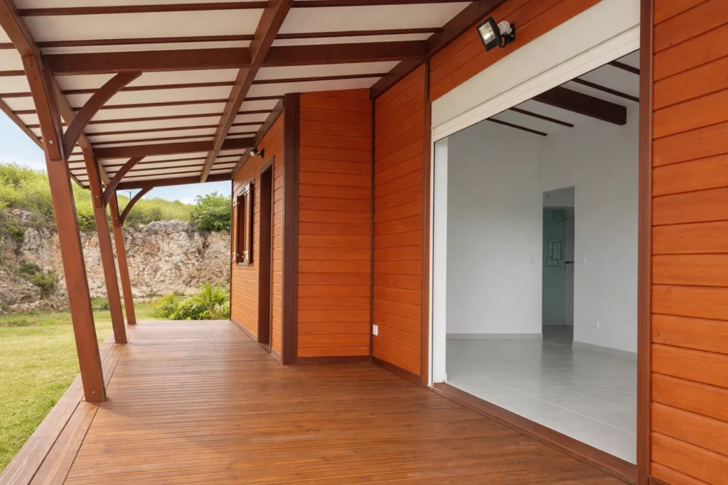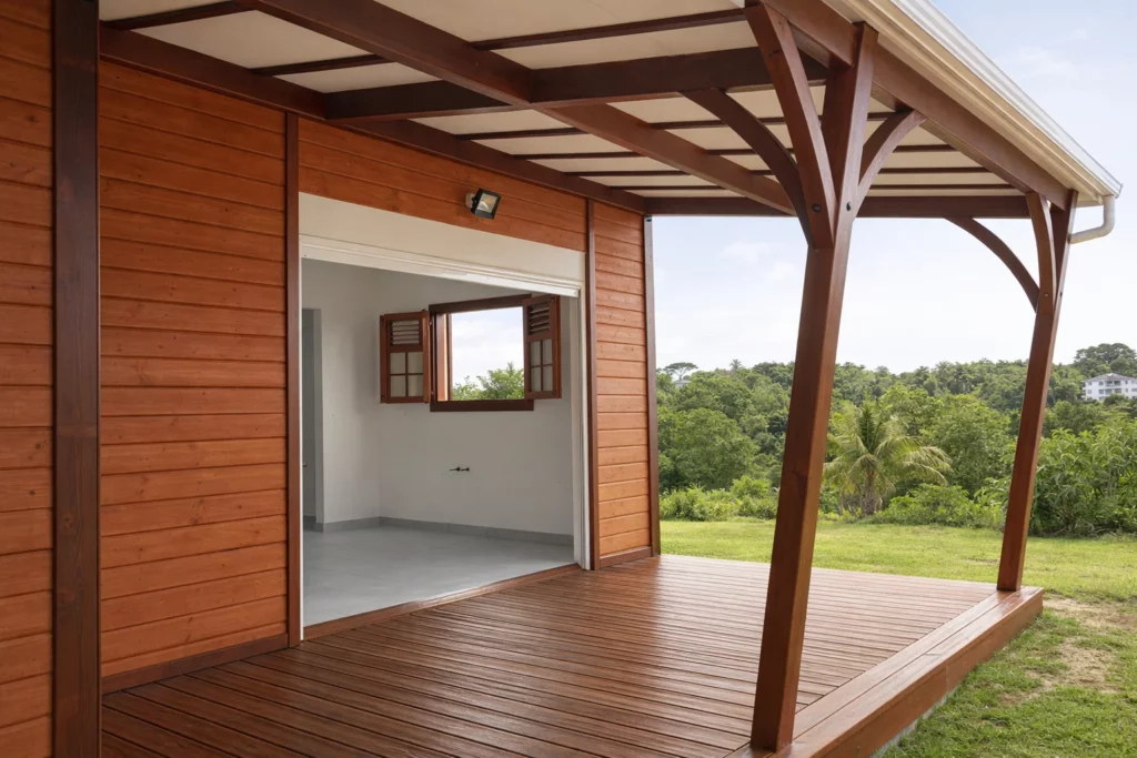 Maison architecture moderne à structure en bois sur dalle béton.